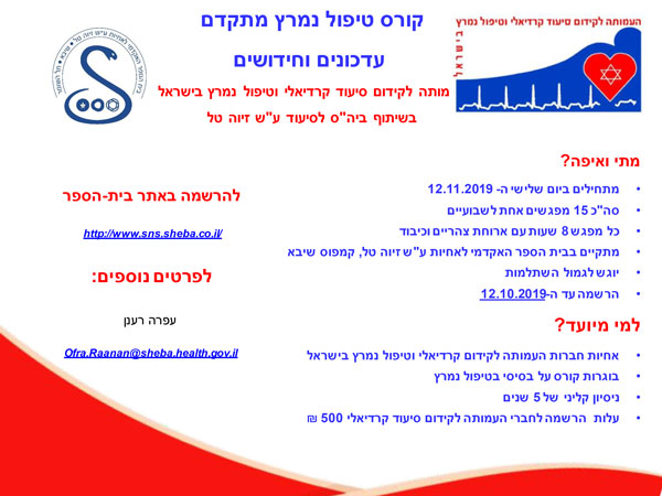 קורס טיפול נמרץ מתקדם עמותה לקידום סיעוד קרדיאלי וטיפול נמרץ בישראל בשיתוף ביה"ס לסיעוד ע"ש זיוה טל מתי ואיפה? מתחילים ביום שלישי ה – 12.11.2019 סה"כ 15 מפגשים אחת לשבועיים כל מפגש 8 שעות עם ארוחת צהריים וכיבוד מתקיים בבית הספר האקדמי לאחיות ע"ש זיוה טל, קמפוס שיבא יוגש לגמול השתלמות הרשמה עד ה – […]